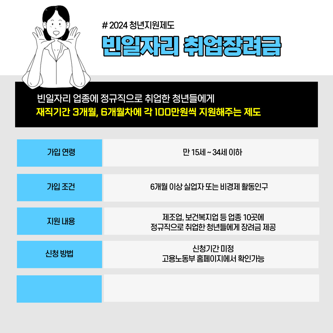 빈일자리업종 10곳에 정규적으로 취업하는 청년들에게 재직기간 3개월 6개월 차에 각 100만 원씩 최대 2백만 원을 지원합니다